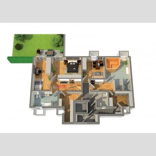 (bestehend aus Wohnzimmer, Flur, Diele, WC, Küche, Terrasse EG, Zimmer I, Zimmer II, Diele, Terrasse UG, Bad)