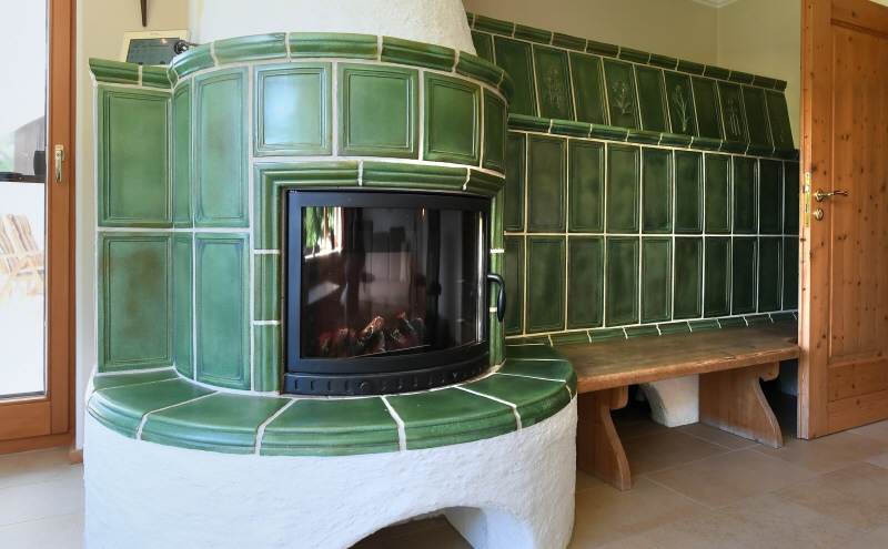 Im großzügig geschnittenen Wohnzimmer sorgt ein traditioneller Kachelofen für wohlige Wärme, während die stilvolle Deckenbeleuchtung eine angenehme Atmosphäre für entspannte Abende schafft.