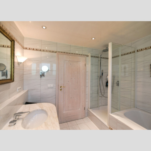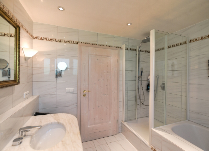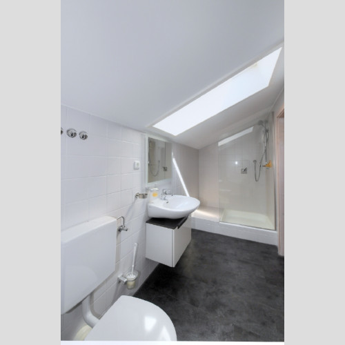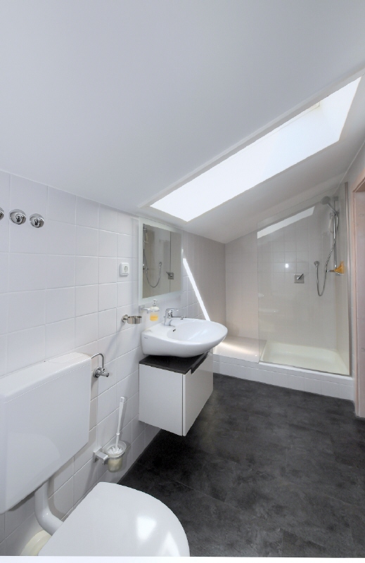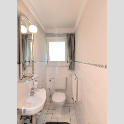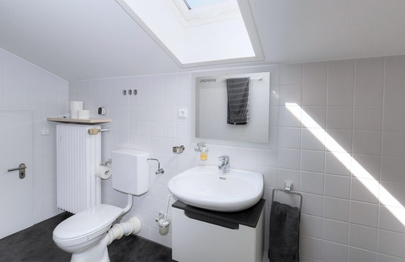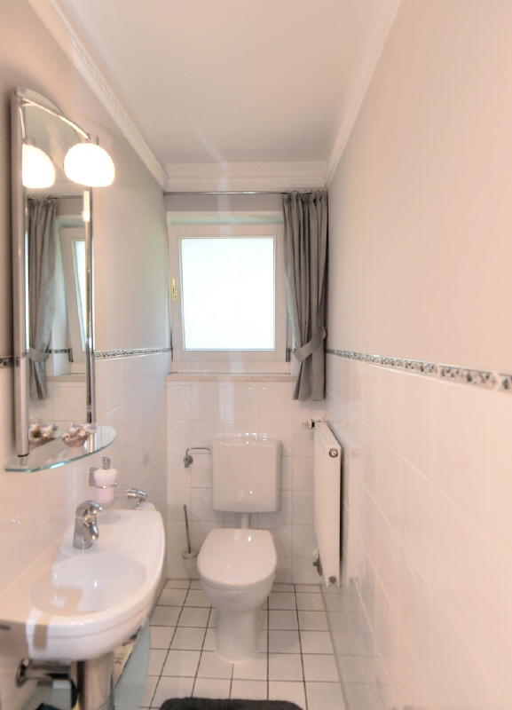 Ein modernes, hell gefliestes Badezimmer ergänzt das Raumangebot auf dieser Ebene und sorgt mit seiner funktionalen Ausstattung für zusätzlichen Komfort.