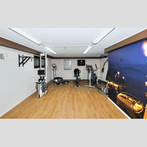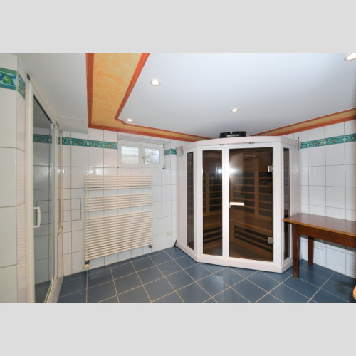 Der großzügig gestaltete Kellerbereich bietet vielfältige Nutzungsmöglichkeiten und hohen Komfort. Ein Wellnessraum mit Dampfbad, Infrarotsauna und moderner Dusche lädt zum Entspannen und Wohlfühlen ein. Zusätzlich steht ein großzügiger Hobby- und Fitnessraum zur Verfügung, der ausreichend Platz für Sport und kreative Aktivitäten bietet.