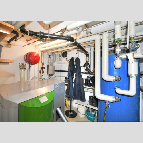 Die große Werkstatt ist perfekt für handwerkliche Projekte und technische Arbeiten ausgestattet. Für die Haustechnik gibt es einen separaten Heizungsraum, der an den angrenzenden Pelletsraum grenzt. Praktische Annehmlichkeiten wie eine Hausstaubsaugeranlage und ein Hauswirtschaftsraum runden das Angebot im Keller ab und sorgen für eine funktionale und komfortable Wohnumgebung.