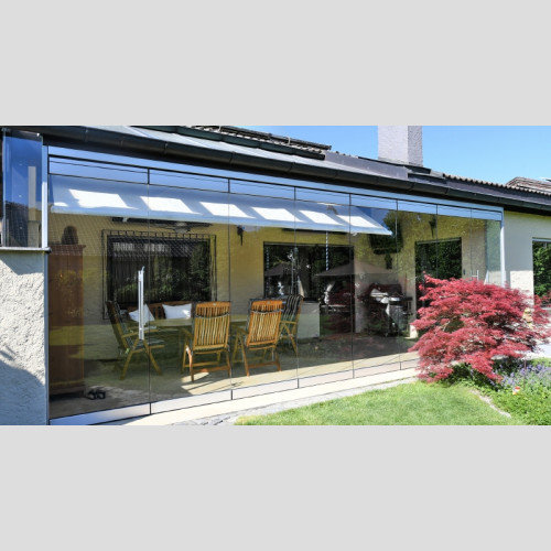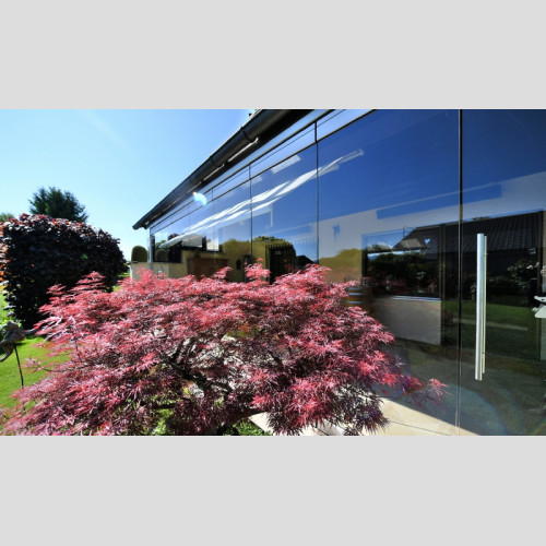 * Terrasse = Wintergarten vollverglast mit Schiebetüren zusätzlicher Heizung (Blick in Garten)