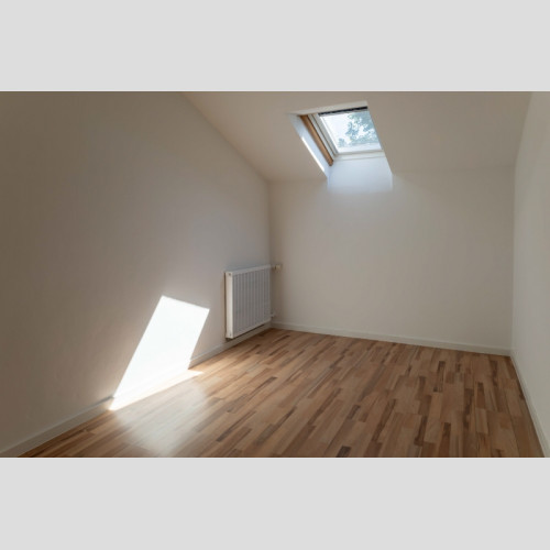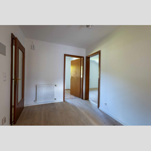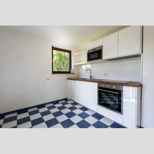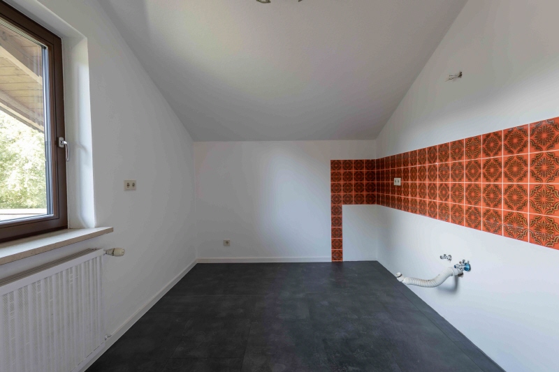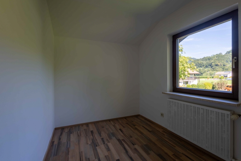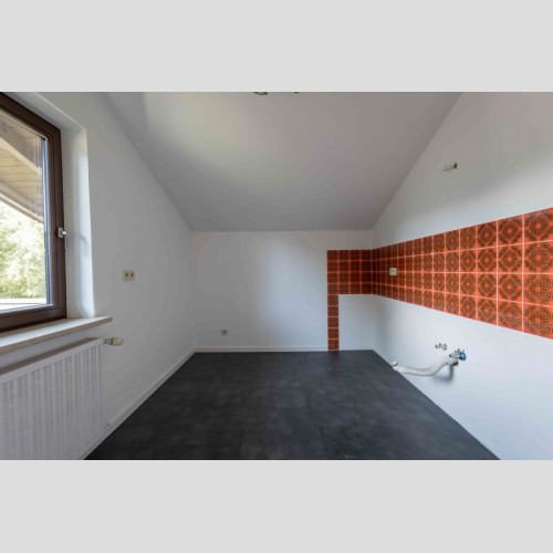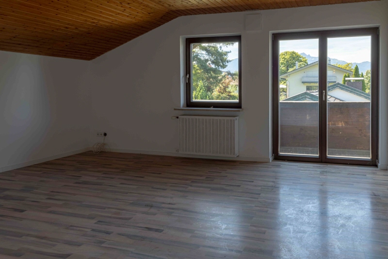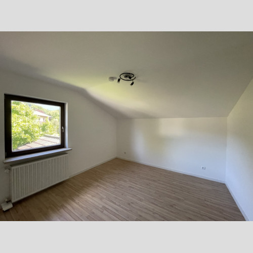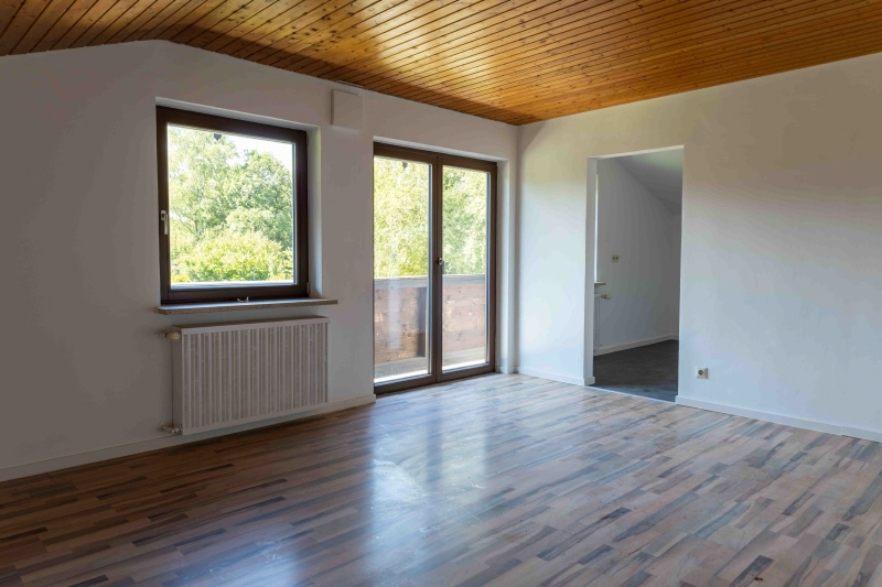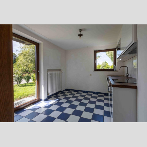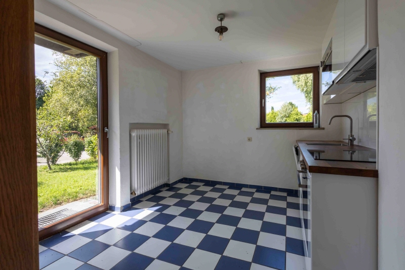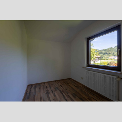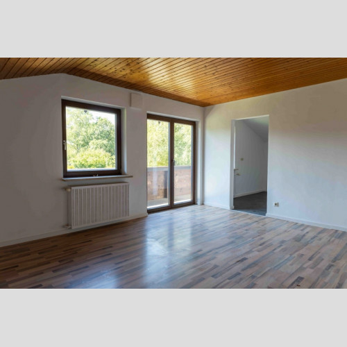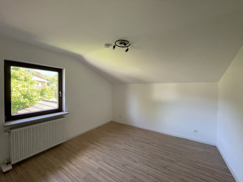 Die Obergeschosswohnung verfügt über einen eigenen Zugang und bietet ebenfalls eine helle und freundliche Wohnatmosphäre. Mittelpunkt ist das Wohnzimmer mit Zugang zum Westbalkon der einen schönen Blick ins Grüne eröffnet. Auch hier steht eine separate Küche mit Platz für eine kleine Essecke zur Verfügung.
