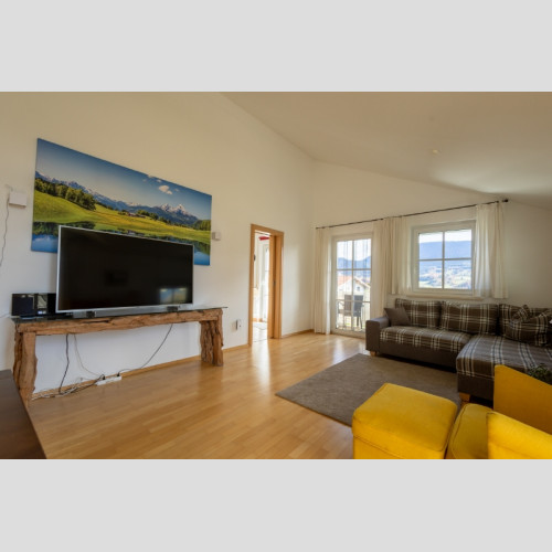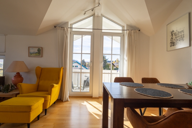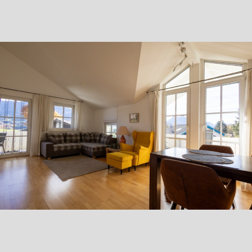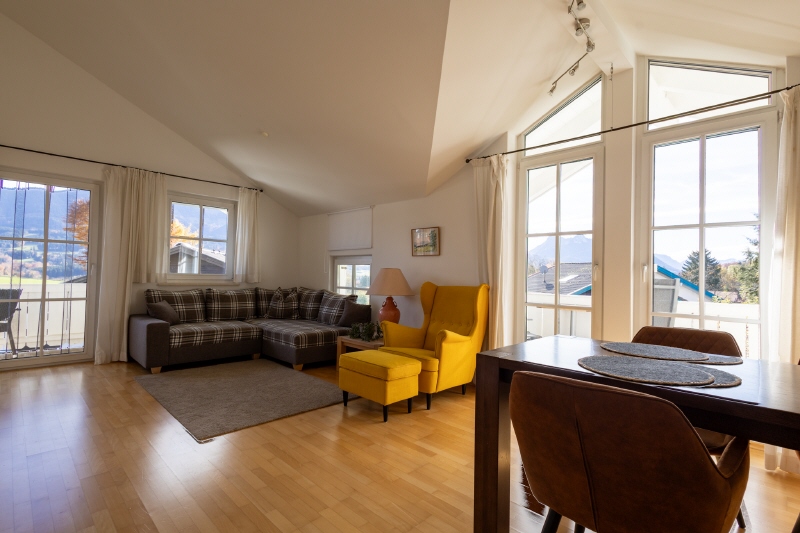 Der großzügige Wohnbereich ist hell und offen gestaltet und bildet das Herzstück der Wohnung. Große Fensterflächen sorgen für viel Tageslicht und eröffnen einen beeindruckenden Blick auf die Berge. Von hier aus besteht Zugang zu einem der beiden Balkone, die ausreichend Platz zum Entspannen bieten und zu jeder Tageszeit den Ausblick in die Natur genießen lassen.