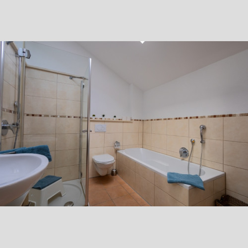 Die Küche ist mit einer Einbauküche ausgestattet und bietet ausreichend Platz für den täglichen Bedarf, hier befindet sich der zweite Balkon. Das Badezimmer ist gepflegt und funktional mit einer einem Waschbecken, WC, einer Badewanne und einer Dusche gestaltet.